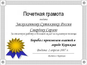 Уважаемая редакция ИА Сутяжник-пресс. Лично я и мои друзья постоянно обращаемся за помощью к Сергею Смердову по различным правовым промблемам в г. Коряжма. В данное время идет борьба с мэром города, в городе отсутствуют общественные туалеты, а администрация отказывается упорно их строить. Судьи оставляют без движения исковые заявления против мэра. Сергей помогает нам в составлении исковых заявлений, обжалования решений судов и т.д. Хорошо, что есть такая организация как Сутяжник и такие люди как Сергей. Мы рады вручить Сергею Смердову почетную грамоту за оказание помощи жителя г. Коряжма.