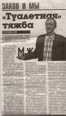 Под таким заголовком вышел материал в очередном номере Архангельской областной газеты от 22 Ноября 2007года. Борец за права граждан на туалет Сергей Плехов судится с городской администрацией. Суд неизменно принимает сторону Мэра и отказывает в рассмотрении дела.