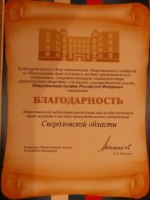12-13 октября в Москве прошел Общероссийский съезд членов Общественных наблюдательных комиссий, организованный Общественной палатой Российской Федерации. Среди приветствовавших участников - представители Совета Федерации, Государственной Думы и различных силовых ведомств. Были обсуждены проблемы реализации федерального закона 76-ФЗ "Об общественном контроле в местах принудительного содержания..." и проблемы взаимодействия государственных органов с формирующимися и действующими общественными наблюдательными комиссиями. Общественная палата Российской Федерации оценила работу ряда региональных комиссий. В частности, благодарностью была отмечена Общественная наблюдательная комиссия Свердловской области "За большой вклад в дело становления общественного контроля за обеспечением прав человека в местах принудительного содержания и совершенствование взаимодействия гражданского общества с органами государственной власти".