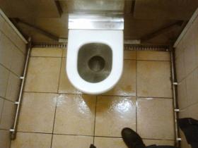 При входе вас встречает теплое веяние того, что читатель должен домыслить самостоятельно. Прослезившись от запаха, видишь блестящую (от сырости) плитку, три метра шириной корридор и по 4 кабинки справа и слева. У двери каждой кабинки мини "светофор". Красный - занят, желтый - загорается при выходе посетителя и до момента загорания зеленого в кабинке что-то шумит (вероятно - авто-уборка), зеленый - заходи.