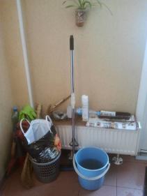 Убранство туалета украшено цветами - один букетик у рулонища никому не нужной в обшем помещении туалетной бумаги, а второй - над выложенными на всеобщее наслаждение ведром, тряпками, моющими средствами... Именно эти средства и орудия труда берет Президент Крмлевского туалета (вместо того, что урчит после зажигания желтого сизнала светофора) и начинает чистить кабинки. После орудия труда возвращаются на общее обозрение под цветочек.