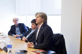 Ян Шлихтман после выступления и за дружеским обедом поделился своим видением судебной системы США через призму собственного 35-летнего опыта работы юристом по ведению стратегических судебных дел в судах США против крупнейших корпораций, загрязняющих окружающую среду. "Наша судебная система закрытая, ритуальная и дорогая, - периодически повторял Ян, далее объясняя свои тезисы. - Выход только в том, чтобы создать альтернативу судебным разбирательствам. Но нужно пользоваться тем, что есть и говорить об этом, просвещать. В этом призвание юриста" (подробнее читайте http://sutyajnik.ru/news/2014/03/2308.html).