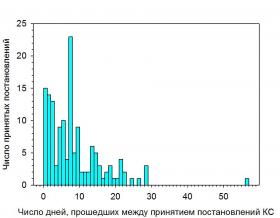 С вероятностью 99,3% КС должен опубликовать очередное постановление через 28 дней со дня принятия предыдущего постановления (27.10.2015), т.е. до 24 ноября включительно. Подождать осталось 8 дней. Посмотрим, не подкачает ли статистика. Впрочем, лишь бы не подкачал Конституционный Суд!
