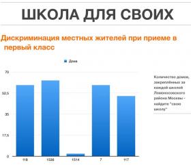 Я начал обращаться с этим вопросом в департамент образования, затем в министерство образования и мэрию. И везде получал традиционные одностраничные отписки, что моё письмо передано в департамент образования, нарушений нет, и так далее. Взятки я не хотел платить принципиально. Тогда я пошёл в суд. Не вдаваясь в судебные перипетии, которые заняли около года, на уровне Верховного суда в признании незаконным незакрепления домов за гимназией 1514 мне было отказано. В суде я задал вопрос о том сколько детей из ломоносовского района были приняты в первые классы гимназии 1514 за последние 3 года. Вот данные 2015 года: 2012 - 4 ребёнка. 2013 - 6 детей. 2014 - 4 ребёнка. Эта информация содержится в отзыве департамента образования на мой иск. При этом там каждый год набирается по 3-4 первых класса по 30 человек в каждом, а в июле 2015 года Собянин ввёл в строй новое дополнительное здание гимназии (сейчас у гимназии 3 учебных корпуса). В результате сложилась совершенно нелепая ситуация: каждое утро я и многие другие родители, проживающие в Ломоносовском районе, везём своих детей в школы в другие районы Москвы. А в нашем дворе образуется гигантская пробка из машин родителей, которые привозят детей в гимназию 1514. Сейчас у меня подрастает второй ребёнок и мы рассматриваем варианты переезда ближе к школе старшей дочери. Потому что отвозить их каждое утро в школу и из школы представляется ужасно глупой историей. Надо сказать, что после моих исков департамент образования формально закрепил за гимназией 1514 один дом. Правда, этот же дом они закрепили ещё за одной школой нашего района. В результате, родители стали покупать прописку в этом "закреплённом доме". В прошлом году на сайте гимназии 1514 даже висело предупреждение о том, что по фактам поддельной прописки возбуждены уголовные дела. О сути проблемы: московский департамент образования множеством разных способов создаёт искусственные барьеры для поступления в первый класс в школы, которые считает хорошими. Это может быть поступление только после платных подготовительных курсов или, как в случае с гимназией 1514, незакрепление территории. История про "свободные места" откровенное враньё. 30 июня 2015 года на сайте гимназии 1514 было размещено объявление, что имеется 33 свободных места. 1 июля 2015 года в 9 утра мной было подано заявление о приёме дочери в первый класс. В 10.36 я получил письмо из гимназии об отказе в приеме в первый класс в связи с отсутствием свободных мест. Не надо быть Шерлоком, чтобы догадаться как и на каких условиях эти места были распределены. Недоступность начальной школы по месту жительства - полный нонсенс." Автор: Илья Полуяхтов, житель дома на ул. Крупской, отец двоих детей