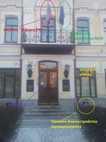 1) исполнению ФКЗ №1 «О флаге РФ» п. 3 2) исполнению ФЗ №15 «Об охране здоровья граждан..» ст. 12 3) исполнению приказа генеральной прокуратуры от 22 января 2009 года №29 п. 3 4) исполнению нормативных актов муниципалитета регламентирующих наличие указателя улицы и установки урн возле зданий. 5) ИНФОРМАЦИОННЫМ СТЕНДАМ, размещенным в прокуратурах.